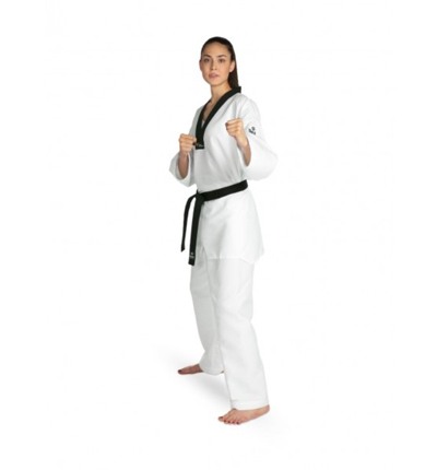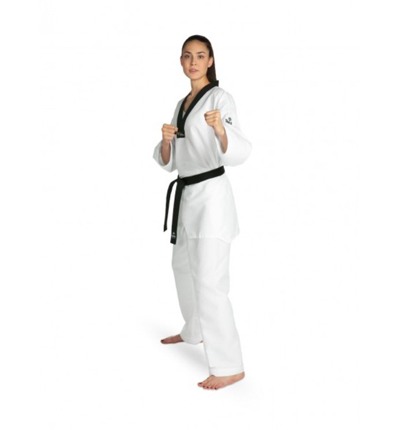 Dobok com gola negra, recomendado para alta competição.