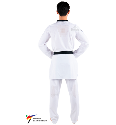 Dobok com gola negra, fabricado manualmente na DAEDO com tecidos Europeus de alta qualidade.